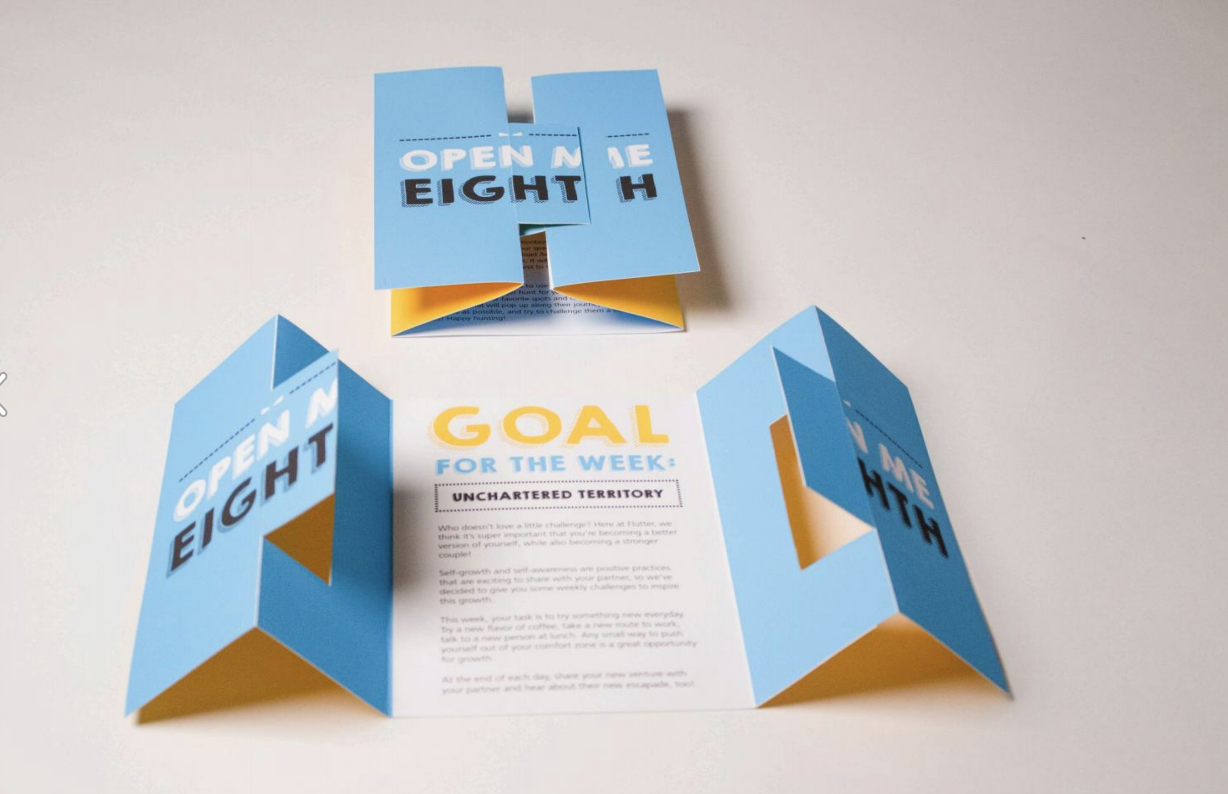 For my senior thesis, I tackled one of love's greatest obstacles: distance. Inspired by unique package design and online dating experiences, I created a subscription-based service that facilitates virtual date nights for couples in long distance relationships. The idea is to help you continue to grow both as individuals as well as a couple, and to keep the magic alive even when you can't physically be together.